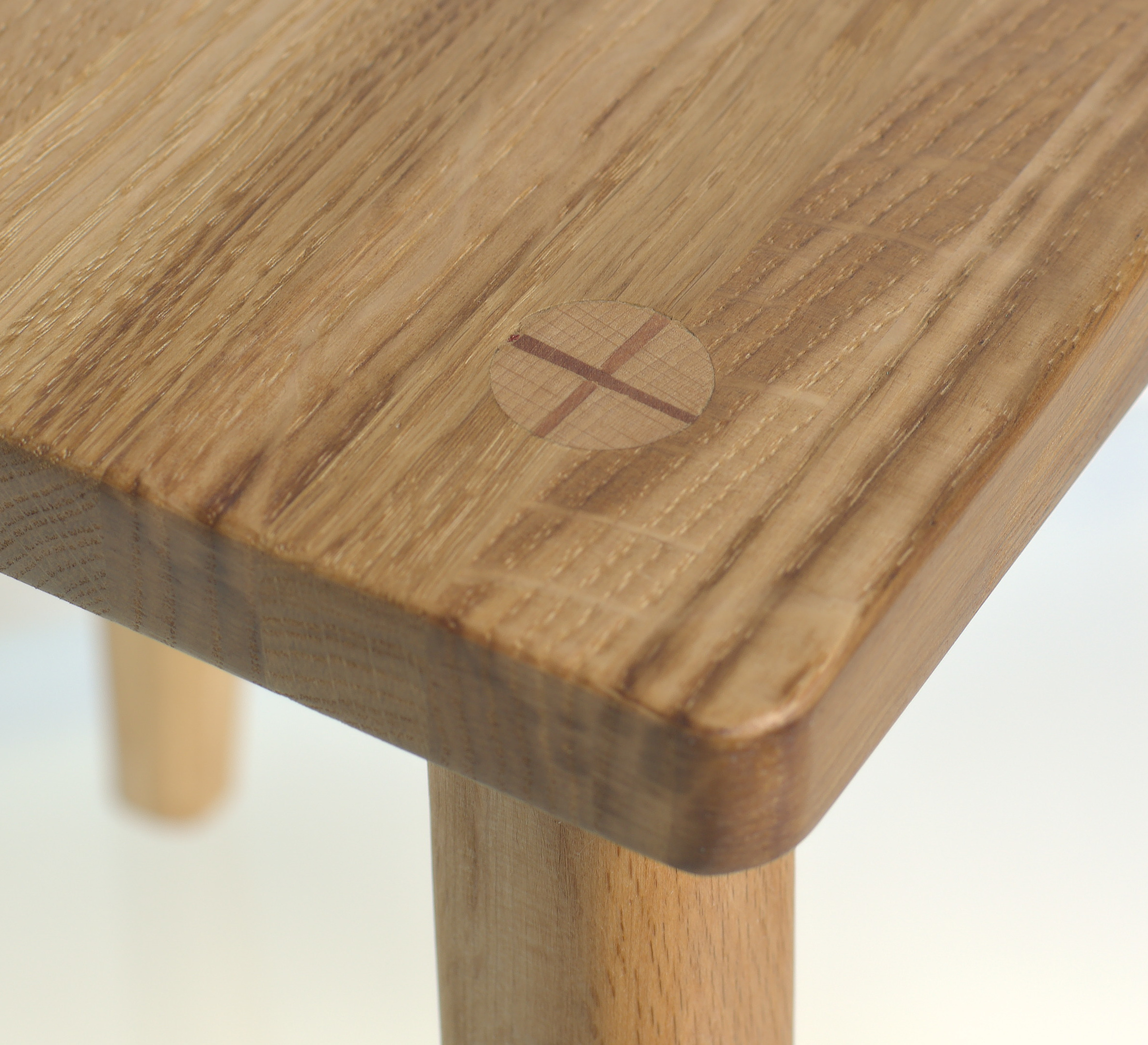 Сделан на традиционных столярных соединениях, ножки закреплены и склеены насквозь через сиденье и укреплены вставками из красного дерева.